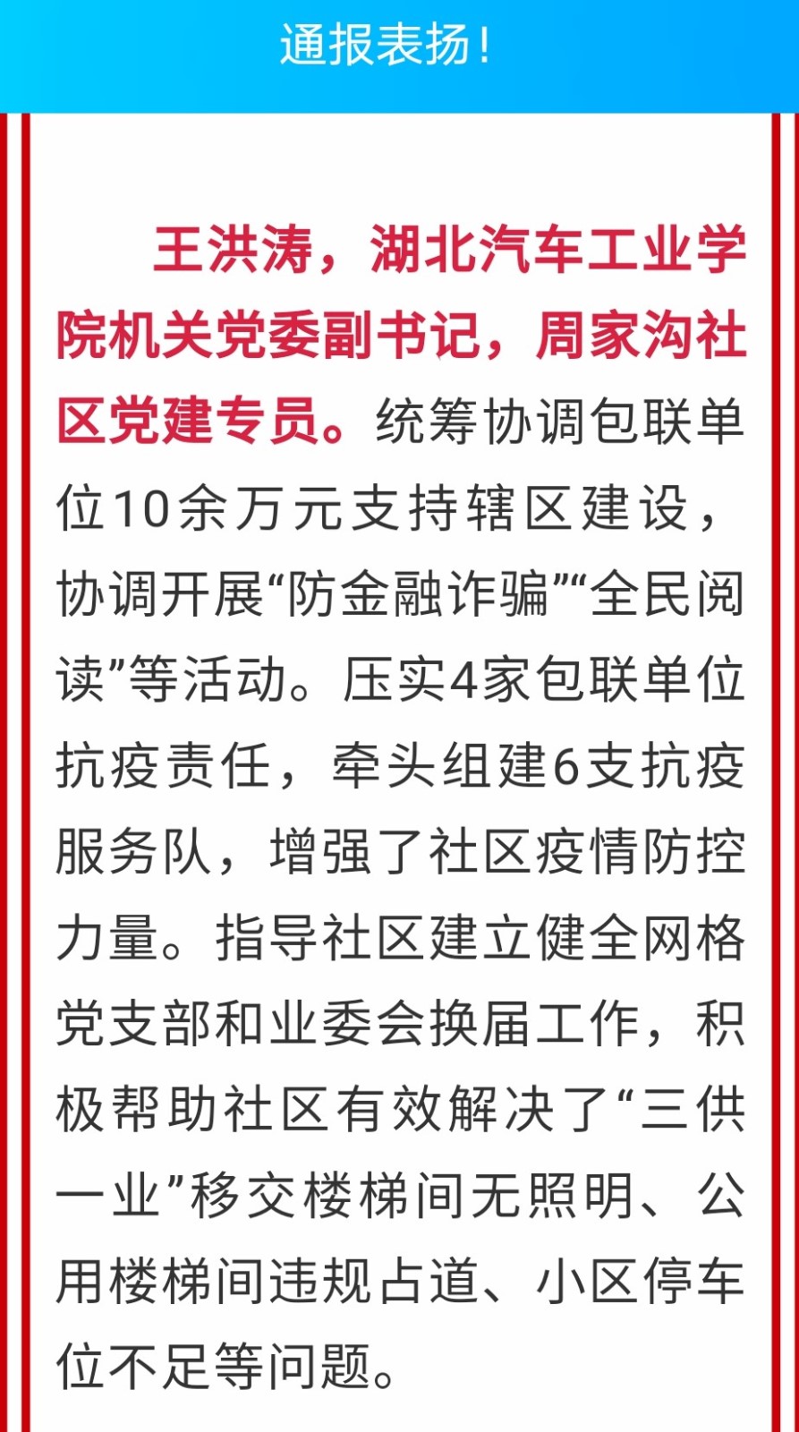 据悉,中共十堰市委组织部春节前发布通报,表扬了党员干部下沉社区工作突出的10位党建专员,我校王洪涛同志从全市149名党建专员里脱颖而出,榜上有名。
