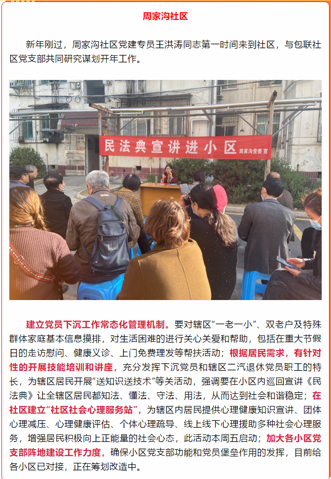 2020年,十堰市委组织部精心选派了149名县级干部担任社区党建专员。根据组织安排,王洪涛担任红卫街办周家沟社区党建专员。工作期间,她充分发挥红色头雁作用,帮助社区解决居民热点、难点问题;帮助社区理清了工作思路、拓宽了工作视野。她主动召集社区“大党委”会议暨共驻共建联席会、“1+2+N”书记和骨干队伍会,以及包联单位会议,并针对小区支部书记进行疫情防控专题培训和具体指导,严格落实“三包一”措施,多次与学校防控办王文山主任到社区共商校园防控工作。她积极发挥桥梁作用,与社区一起利用身边资源筹建了周家沟社区“社会心理服务站”。该服务站由学校心理健康教育中心、十堰市总工会、社会组织和退休党员干部组成7人心理咨询团队,共同服务辖区居民和中小学生。她通过发挥自身优势,创新基层治理举措,提升基层党组织战斗力,提升居民幸福指数,各项工作推进卓有成效,让居民切实享受党建红利。