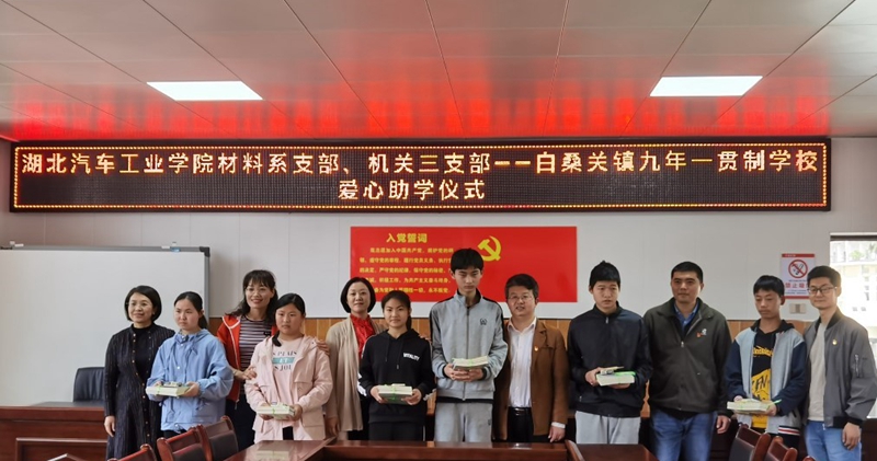 经过前期精心筹备,29日上午,材料学院材料系党支部、机关分党委第三党支部12名党员驱车前往十堰市郧阳区白桑关镇九年一贯制学校,开展“学史力行”支部主题党日活动。座谈会上,白桑关镇九年一贯制学校校长龚士平向党员同志们介绍了该校师资配备、教学工作、贫困生所受学费减免、生活补助等基本情况。捐赠仪式上,党员代表为该校九年级6名家庭经济困难、品学兼优的学生送上了爱心基金,笔记本、中性笔等学习用品,为学校捐赠了6箱衣物。