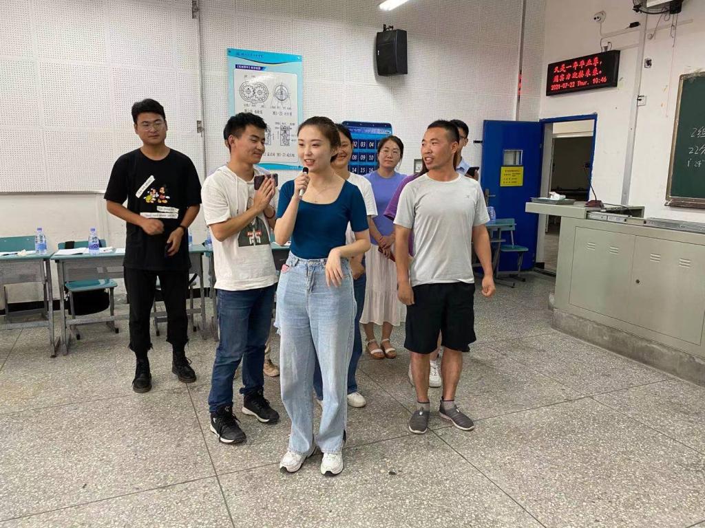 “快问快答”环节,金威威通过位次报数的方式将全班分为三个小组,以既紧张又活泼的“快问快答”让新教师了解党史、国史、市情和校史。在穿插进行的红歌联唱环节,三个小组分别演唱了《我和我的祖国》、《黄河大合唱》、《打靶归来》等红色歌曲,既感受了红色旋律的跳跃和激昂,又领略了歌词之美、意境之美、精神之美。